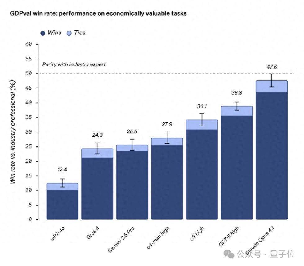最终测试下来,Claude Opus 4.1成为表现最佳的模型,47.6%的产出被评定媲美人类专家成果。
