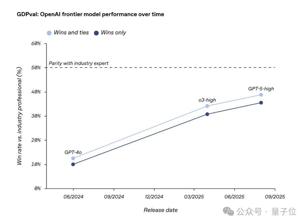 OpenAI各代模型在GDPval上的表现大致呈线性提升。