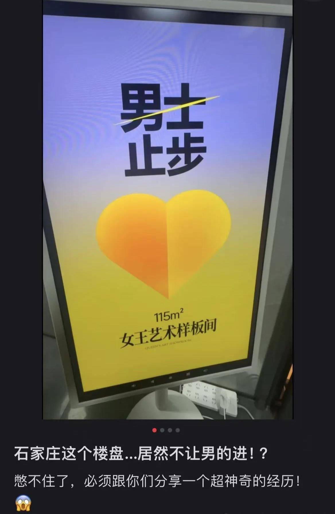 近日,河北省石家庄市一楼盘推出女性专属样板间,仅对女性开放,名为“女王艺术样板间”,面积为115平方米,在样板间外的展板上还可以清楚看到“男士止步”的字样,有网友认为此举是营销噱头。11月21日,桥西区住建局一名工作人员告诉极目新闻记者,目前已通知开发商进行整改。